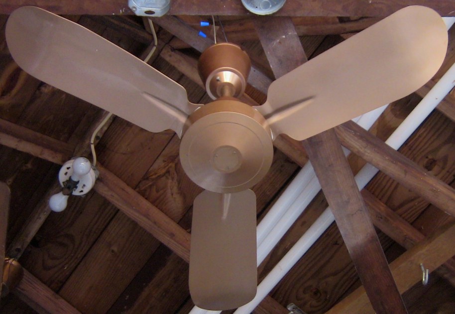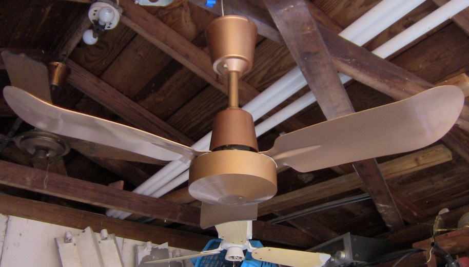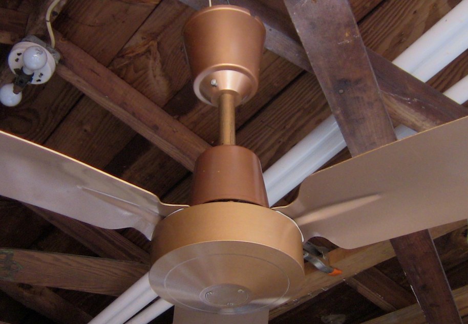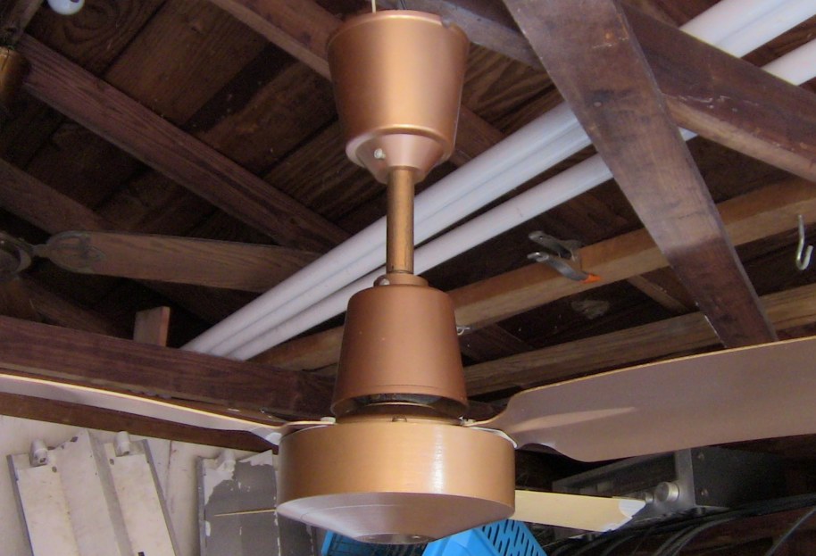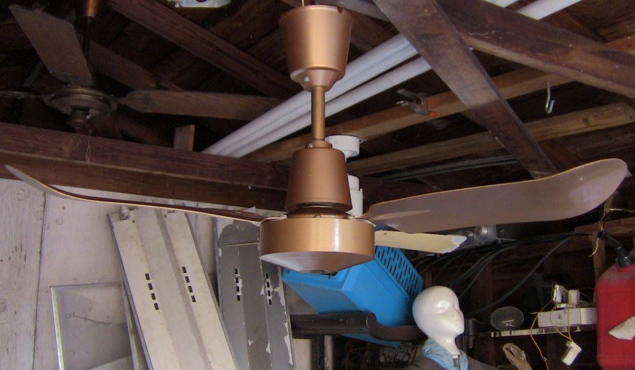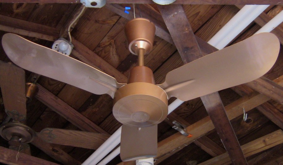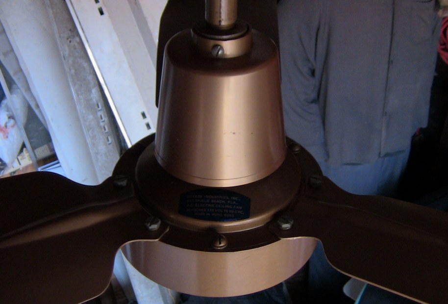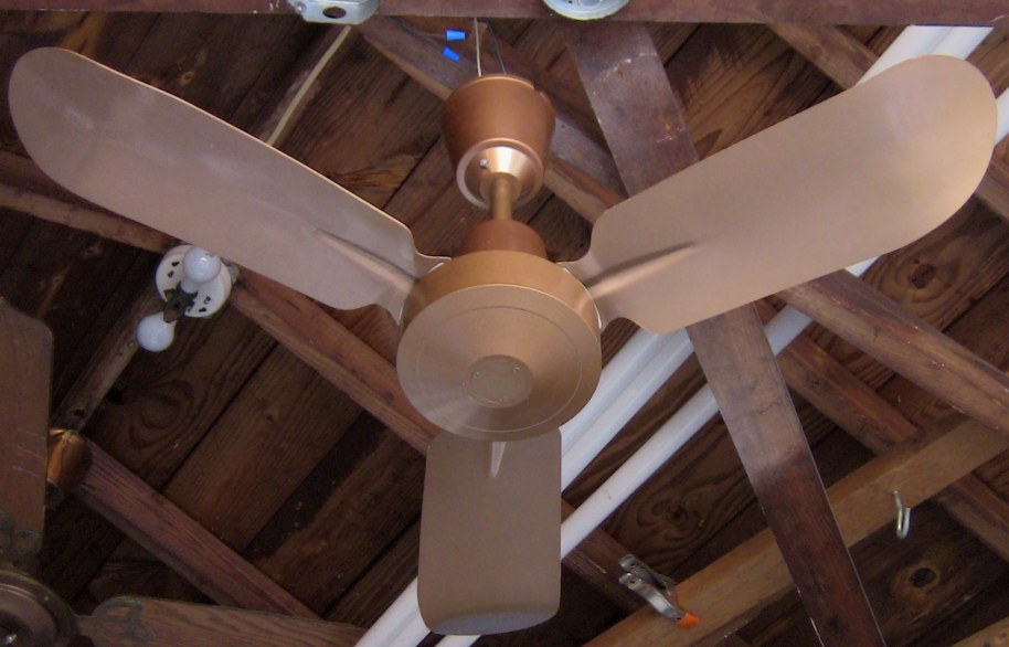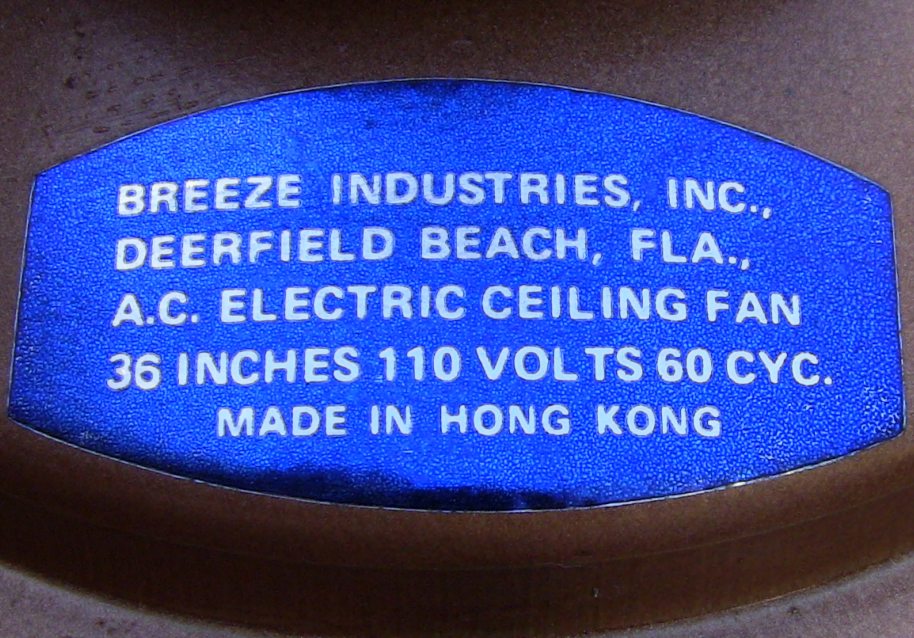 Breeze ceiling fan by Breeze Industries Inc. 36 inch three metal blade ceiling fan from the late 1970s. The finish is in a gold brown color. Was sold with a 5 speed wall control. This ceiling fan is called the "Breeze". S Hook to J-Hook is used to mount. This ceiling fan is light kit adaptable. Made in Hong Kong. Breeze Industries was located in Deerfield Beach Florida. Some of these ceiling fans are label Palco International Corp. The original wall speed controls for these ceiling fans didn't last very long, Any of these types of ceiling fans that are still in use today, more than likely the original speed control was replaced with something else long ago. Neat fan!! |