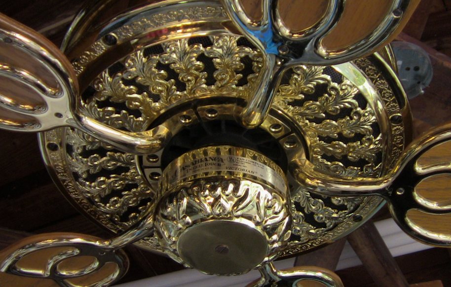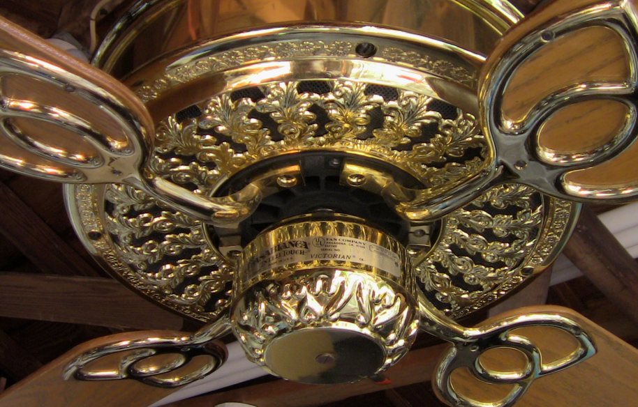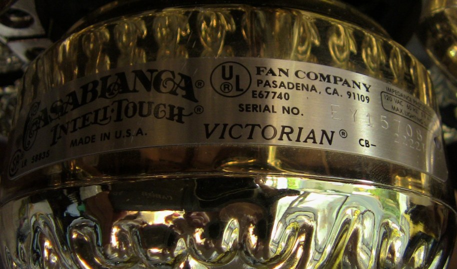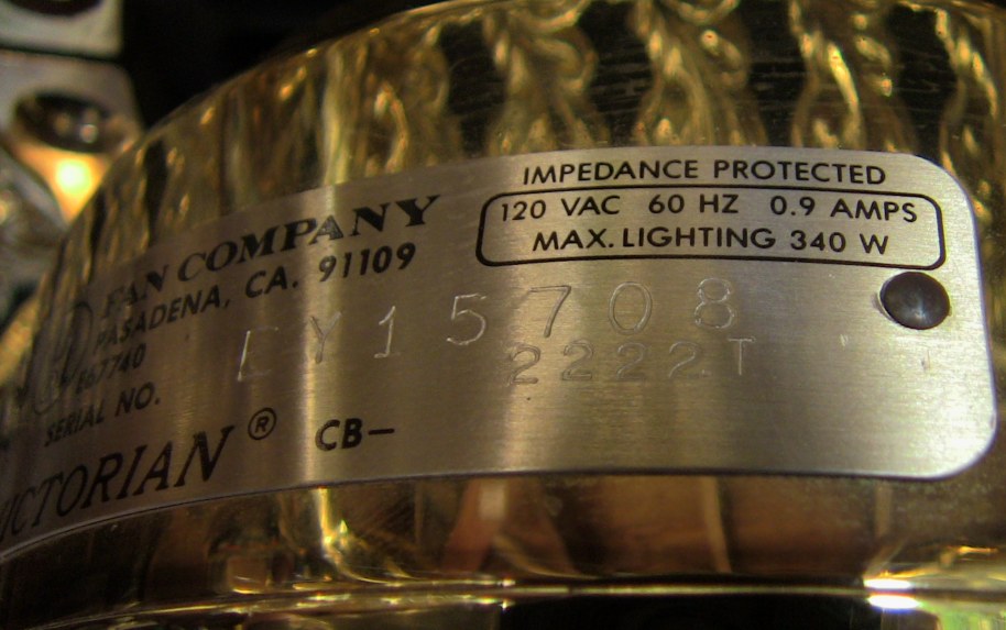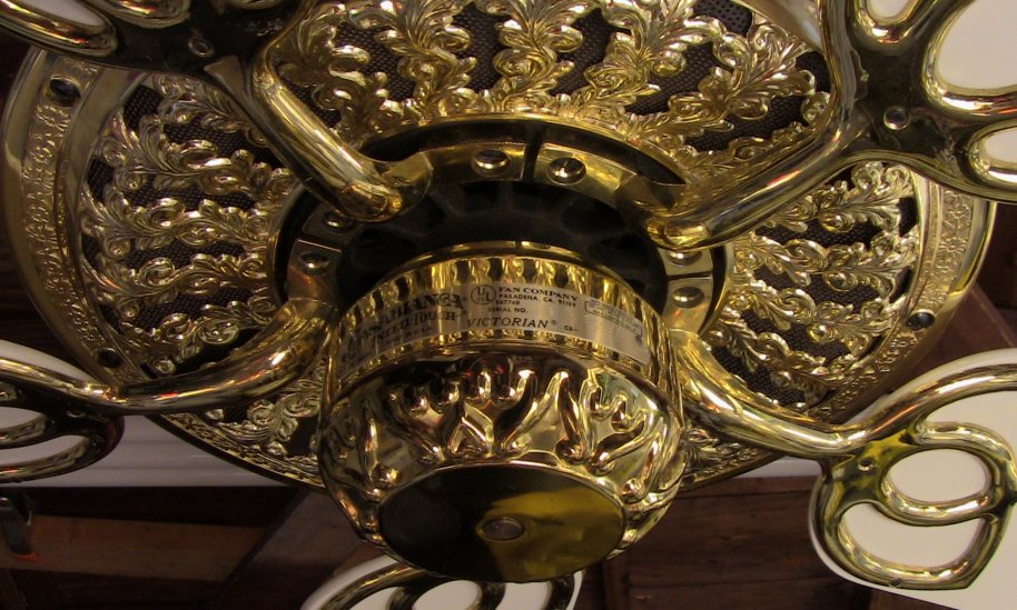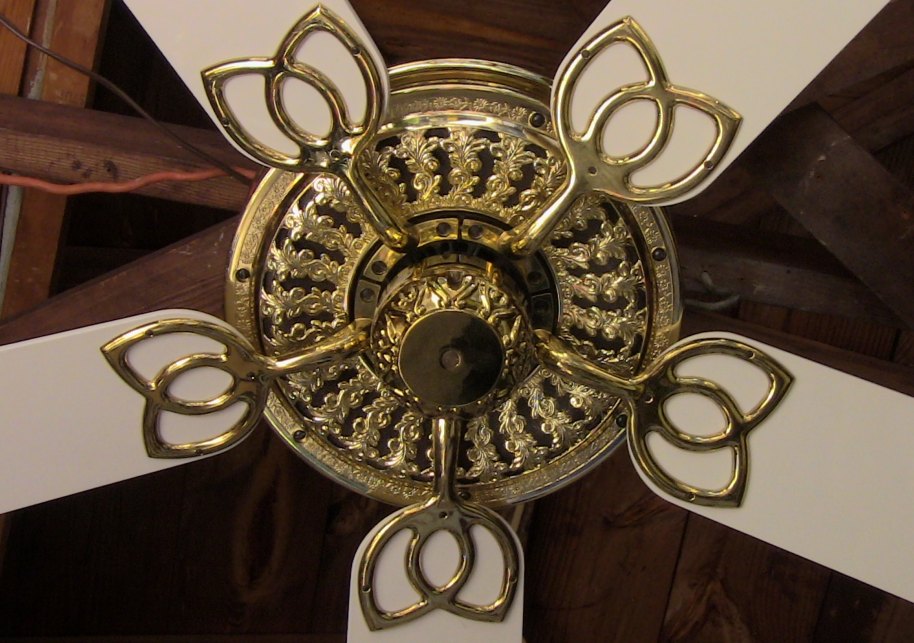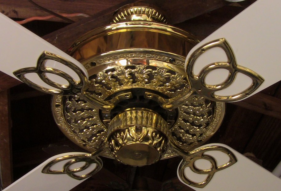 Casablanca Victorian Inteli-Touch ceiling fans from the late 1980s, early 1990s. This ceiling fan is from 1990. Made in the USA by the Casablanca Fan Company. Has a wall control which allows complete control of all functions at the wall. The Inteli-Touch switch model number is W-11. The fan it's self has no controls as it needs it's Inteli-Touch control to function. The functions are: Light control, six speeds starting with low, and reverse operation. Turn fan power on and hold down the fan switch until the first beep is heard. The pitch of the beep gets higher as the fan goes to the faster speeds. The fan can be turned on to high speed first by pressing the fan button for one second after turning the power switch on. The ceiling fan can be reversed by pressing both fan/light switches. Also features a demo mode, which goes through all the fan/light settings automatically. Demo mode can be accessed by pressing both fan and light controls repeatedly every other time. The fan is completely computerized. This ceiling fan can be configured for both 4 and 5 blades. Uses Casablanca's Hang True mounting system. This is a reproduction of an antique Emerson Ornamental from the early 1900's . Many other ceiling fan manufacturers have copied this style throughout the 1990s, five and six blade versions. Neat Fan! |