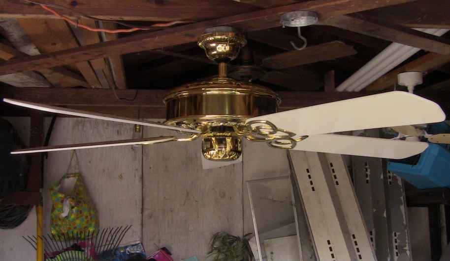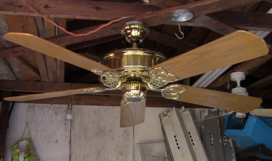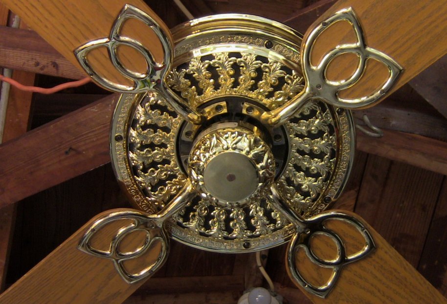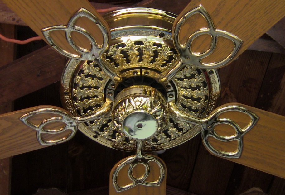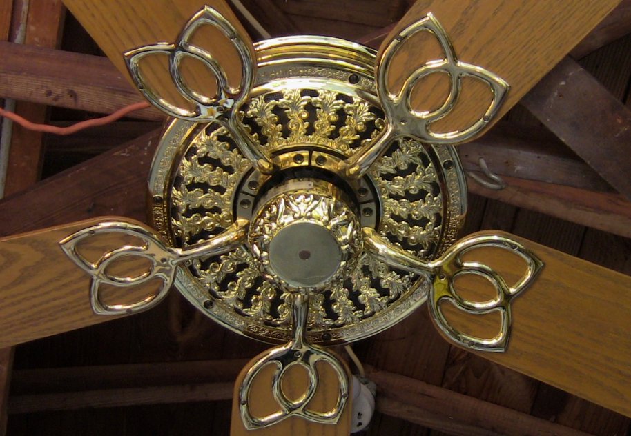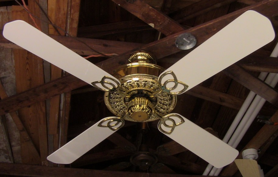 Casablanca Victorian Inteli-Touch ceiling fans from the late 1980s, early 1990s. This ceiling fan is from 1990. Made in the USA by the Casablanca Fan Company. Has a wall control which allows complete control of all functions at the wall. The Inteli-Touch switch model number is W-11. The fan it's self has no controls as it needs it's Inteli-Touch control to function. The functions are: Light control, six speeds starting with low, and reverse operation. Turn fan power on and hold down the fan switch until the first beep is heard. The pitch of the beep gets higher as the fan goes to the faster speeds. The fan can be turned on to high speed first by pressing the fan button for one second after turning the power switch on. The ceiling fan can be reversed by pressing both fan/light switches. Also features a demo mode, which goes through all the fan/light settings automatically. Demo mode can be accessed by pressing both fan and light controls repeatedly every other time. The fan is completely computerized. This ceiling fan can be configured for both 4 and 5 blades. Uses Casablanca's Hang True mounting system. This is a reproduction of an antique Emerson Ornamental from the early 1900's . Many other ceiling fan manufacturers have copied this style throughout the 1990s, five and six blade versions. Neat Fan! |
