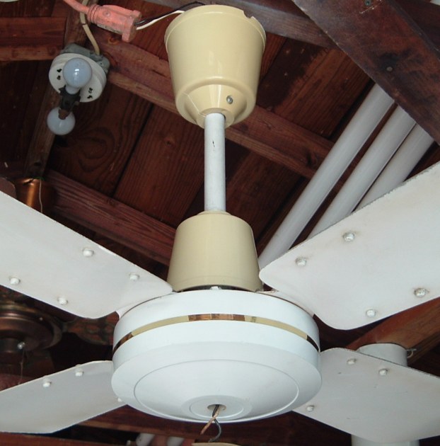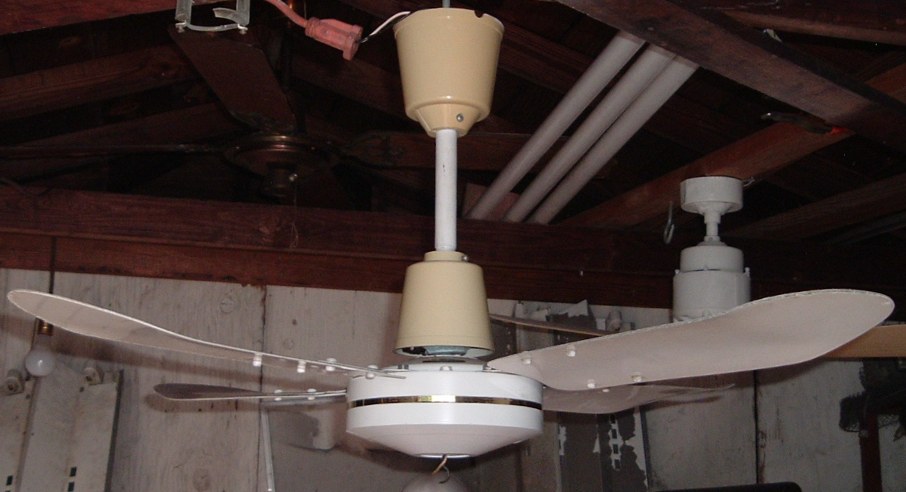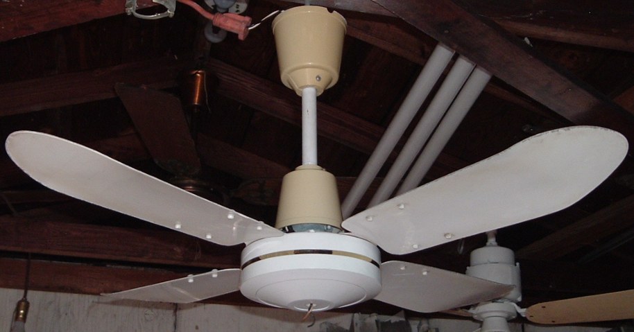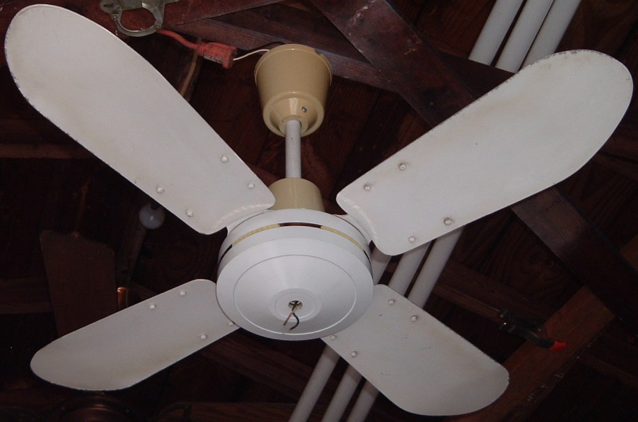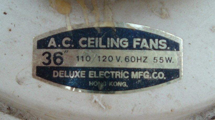 Deluxe Electric MFG.CO. 36 inch 4 metal blade ceiling fan from the late 1970s early 1980s. Made in Hong Kong. Uses a J-Hook to mount. Was sold with a wall speed control. The original wall speed controls for these ceiling fans didn't last very long, Any of these types of ceiling fans that are still in use today, more than likely the original speed control was replaced with something else long ago. Neat fan!! |