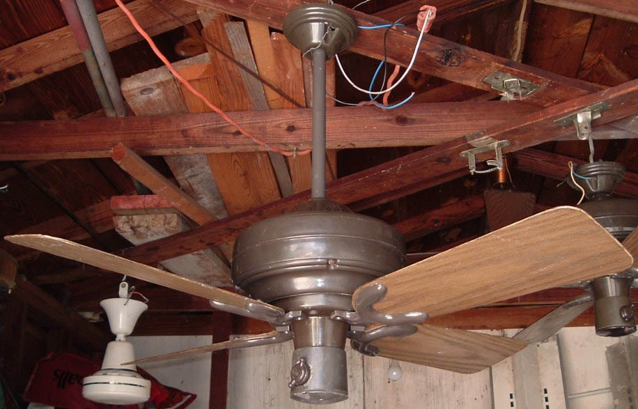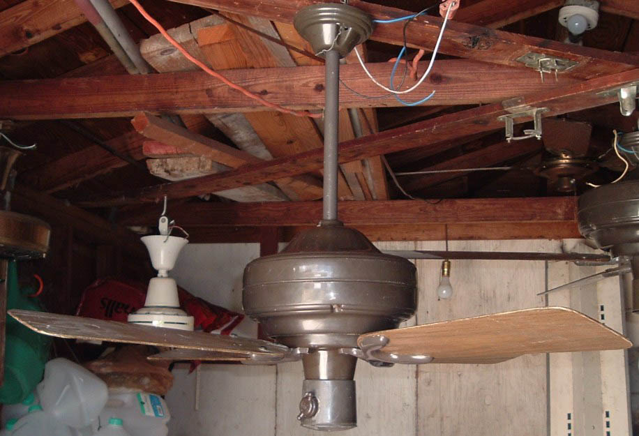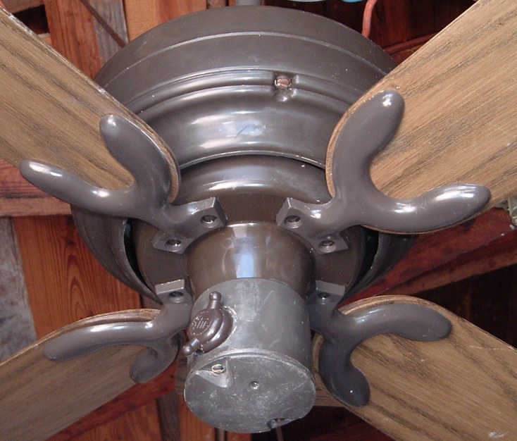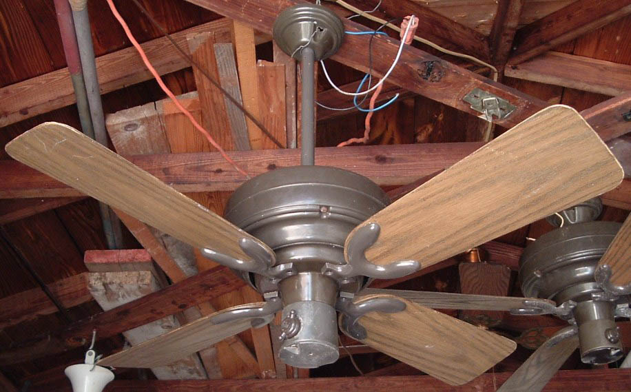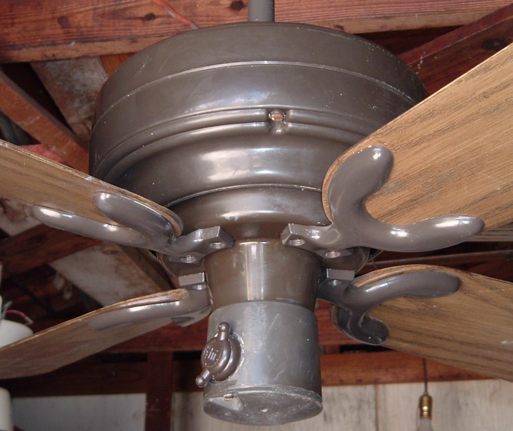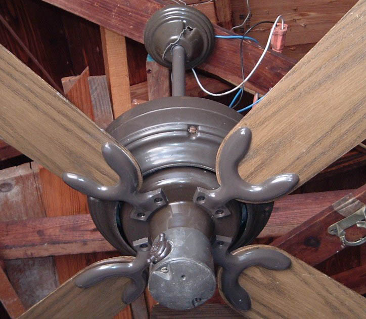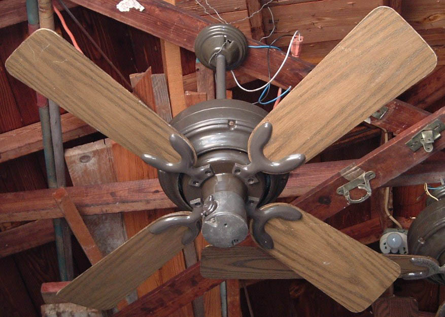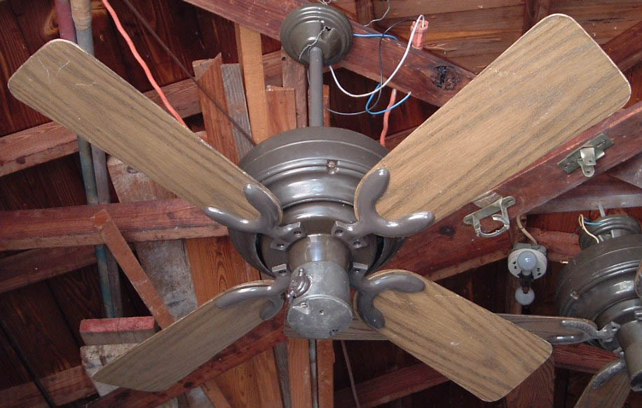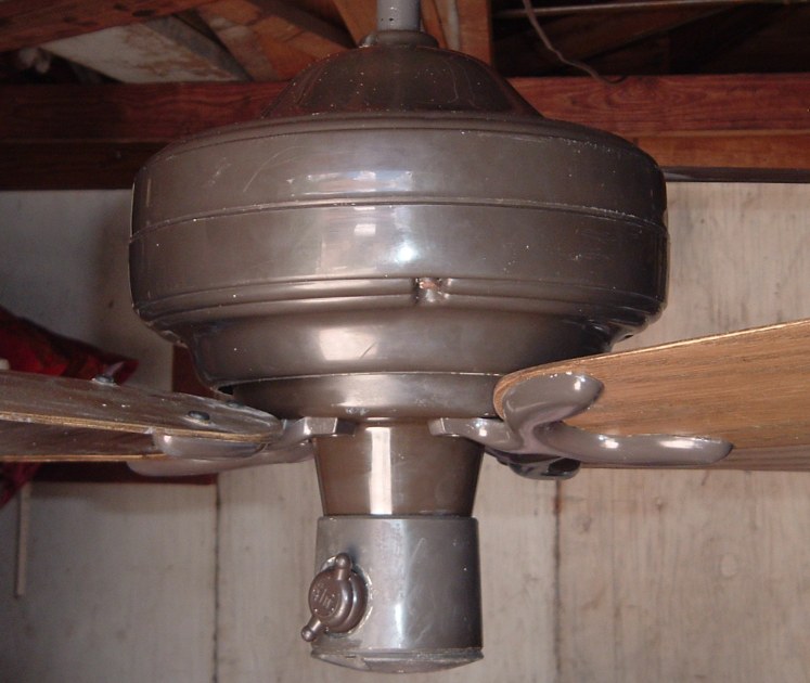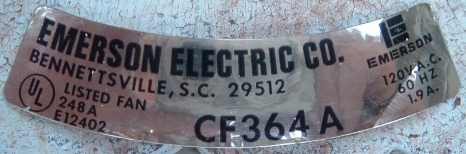 Emerson Casablanca 36 inch ceiling fan model CF364 A from the mid 1970s, early 1980s. These Emerson Casablanca ceiling fans were offered in 36" and 52" sizes, and antique white and dark brown finishes. This is a friction drive ceiling fan, and is quite noisey. Has a on/off variable speed control. The control switch is dated March 6, 1980. These ceiling fans were sold in different varieties of designs and colors. The motor is made in Mexico. The design of the fan was made by Emerson. Also versions that were sold by Sears. Neat ceiling fan!! |