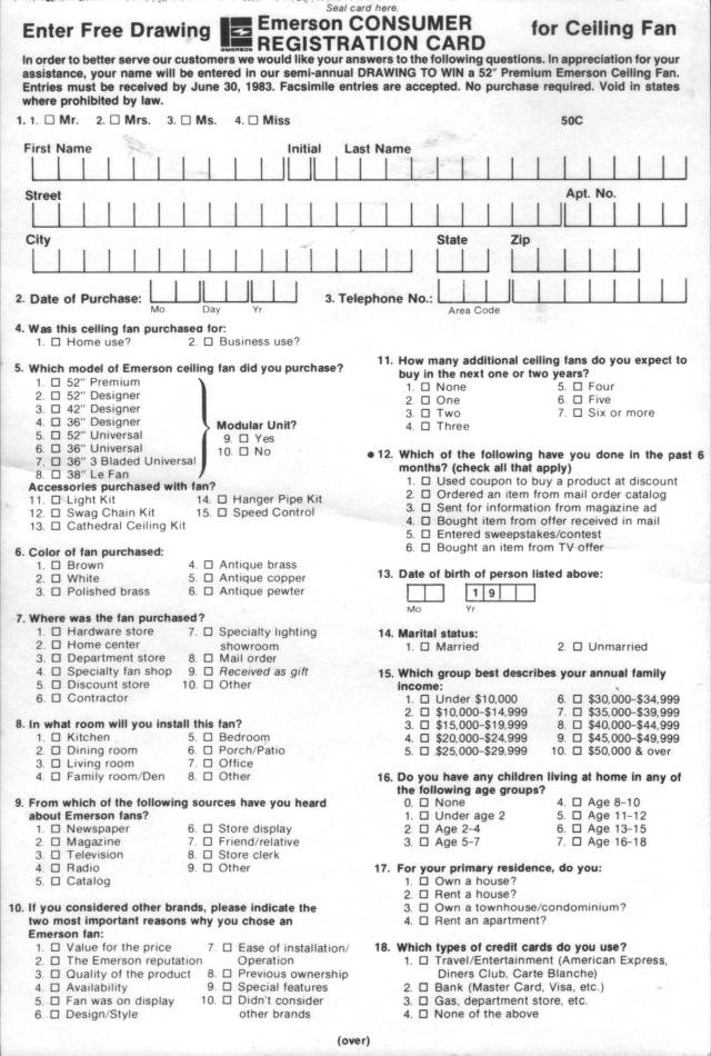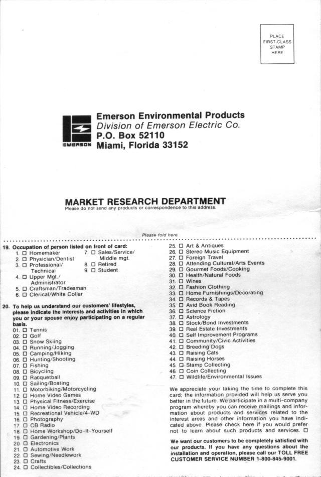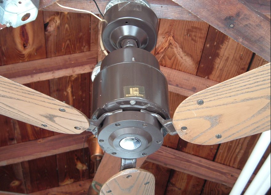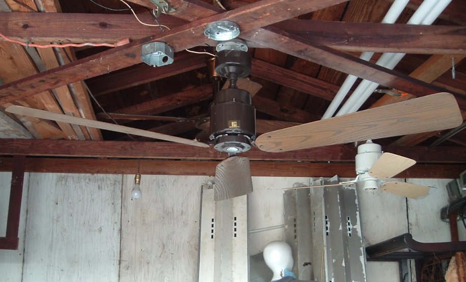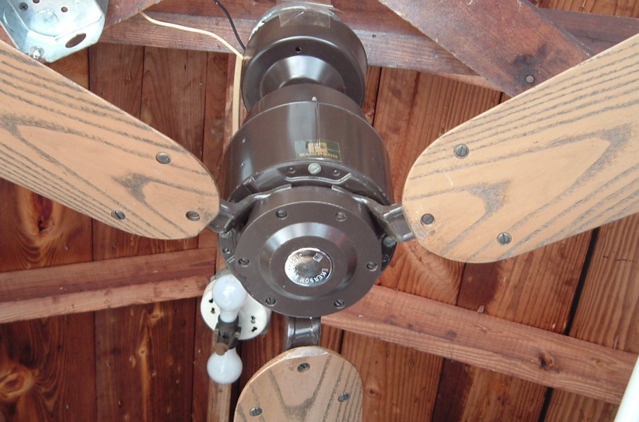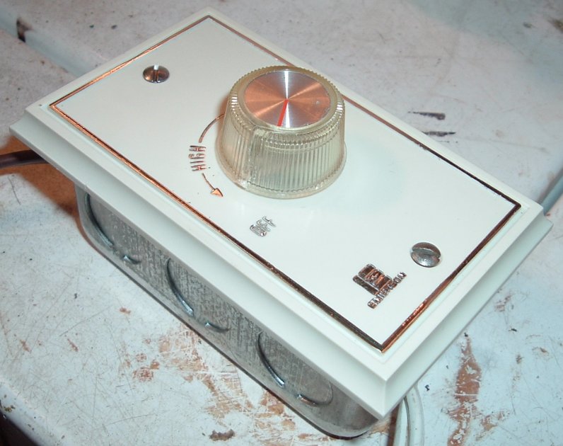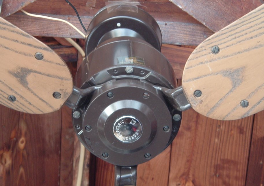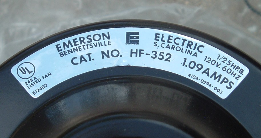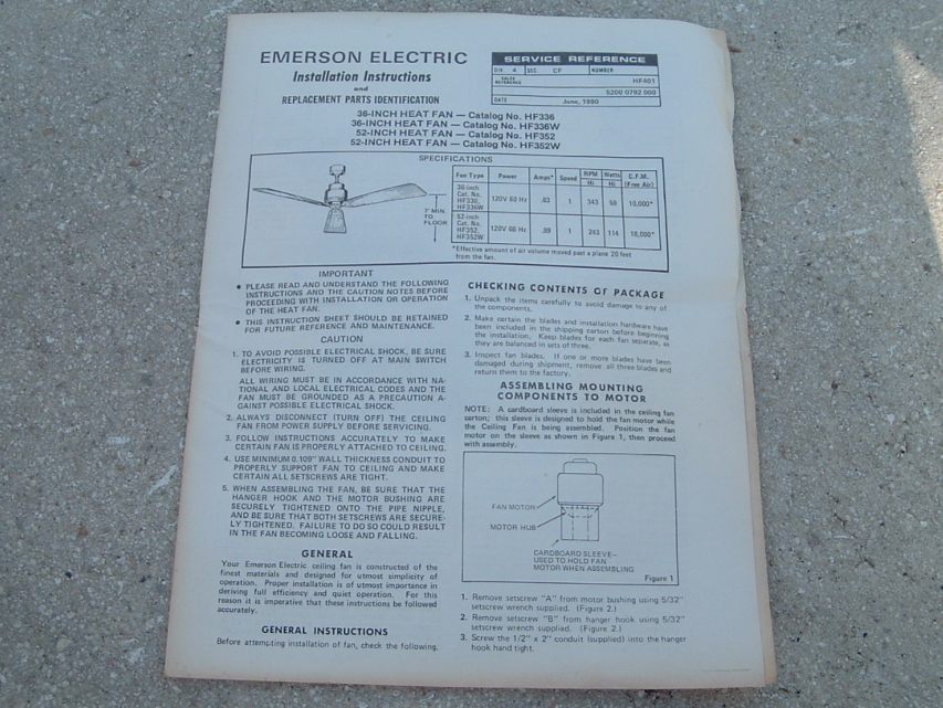 Emerson Heat-Fan ceiling fan a.k.a. Blender Fan. Cat. No. HF-352. Made in the USA by the Emerson Electric Company. The blades are plastic. From the early 1980s. Manual is dated June of 1980. Single speed ceiling fan, unless a separate variable speed wall control is purchased. Down below shows the Emerson control SW81 which is one of the models that are for these ceiling fans. J-Hook is used to mount. Great ceiling fan for it's day. These are die hard ceiling fans and will out last new ceiling fans. |