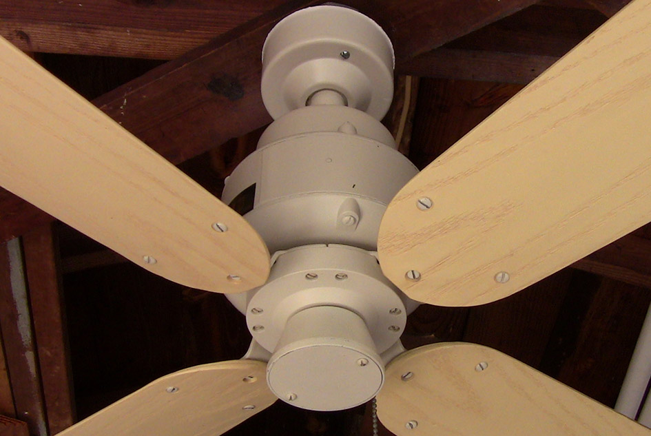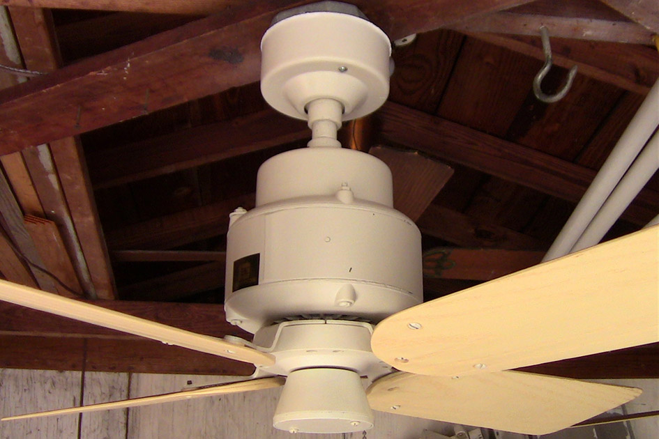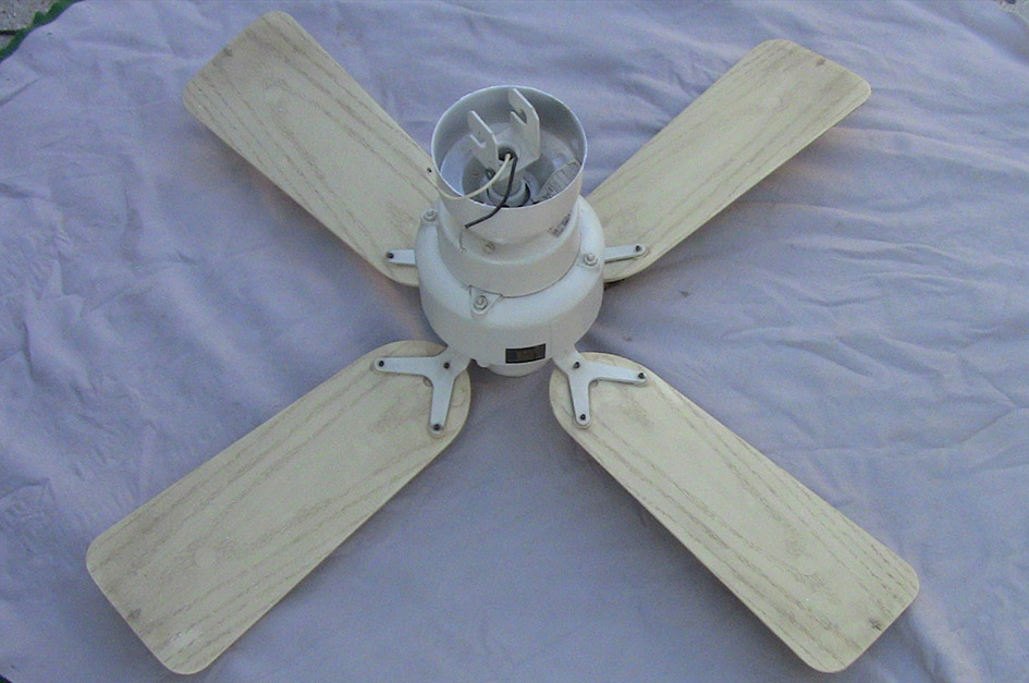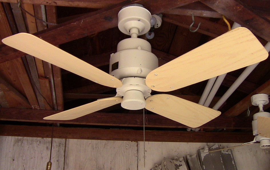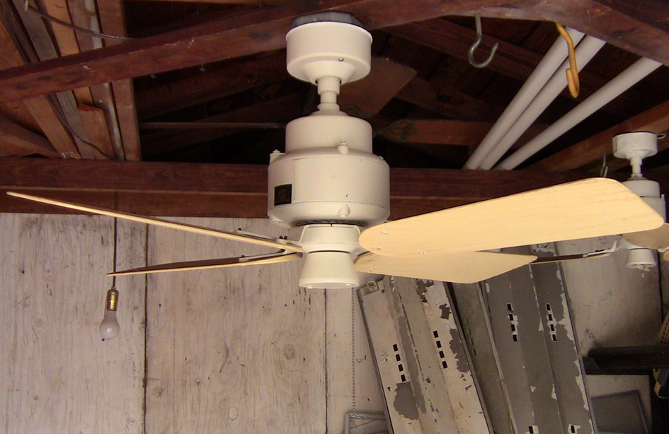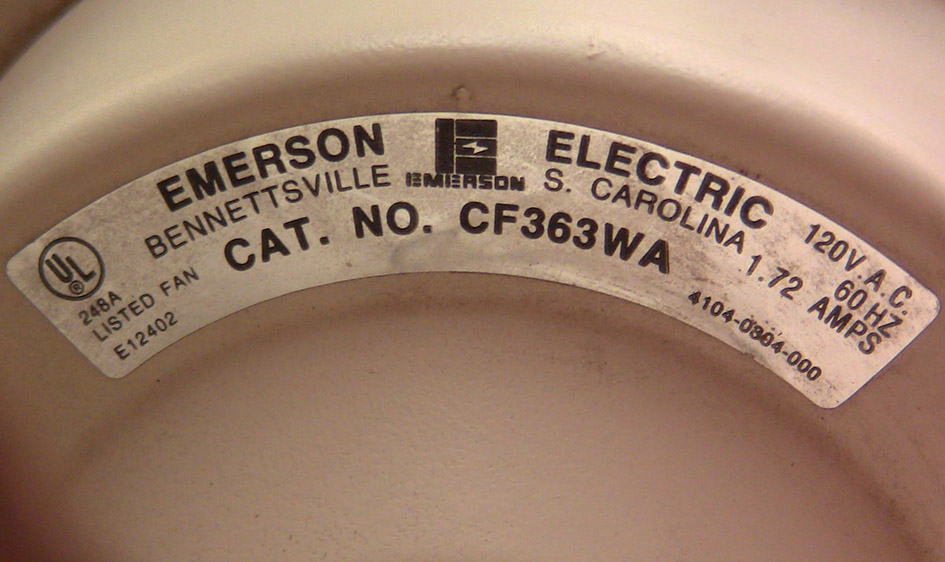 Emerson Universal Series / Heatfan ceiling fan a.k.a. Blender Fan. Cat. No. CF363WA. The 36 inch version with plastic blades. The plastic has yellowed over the years. Great ceiling fan for it's day. This ceiling fan is dated 5-7-80. Has a two speed pullswitch, fast/off/slow/off, and is light kit adaptable. J-Hook is used to mount. These are die hard ceiling fans and will out last new ceiling fans. Alot of cases with these fans, is the oil can capacitor starts failing which in most cases, causes the blades to stop moving. Any of these capacitors can be replaced with a modern box style capacitor as long as it's rated at the same value as the original. |