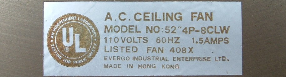 Evergo Original ceiling fan model 4P-8CLW or 52"4P-8CLW. Made in Hong Kong by Evergo Industrial Enterprise, sold and distributed by Evergo Industrial of America, Inc. This ceiling fan was manufactured in the mid 1980s. Replica of the