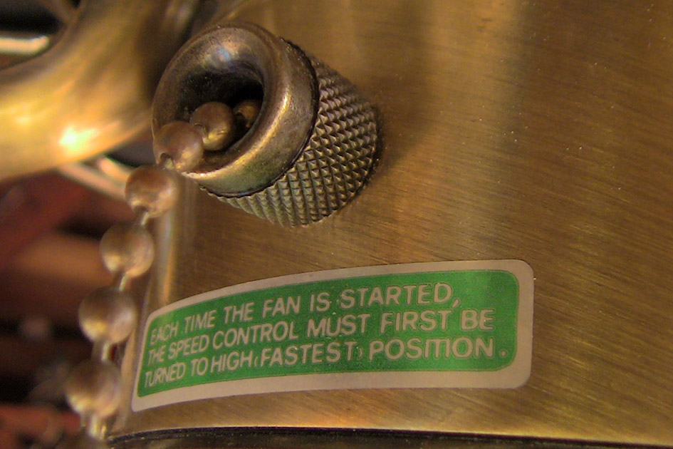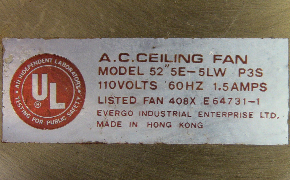 Evergo five blade GE vent ceiling fans model 52"5E-5LW P3S from 1983 and 1984. Made in Hong Kong by Evergo Industrial Enterprise, sold and distributed by Evergo Industrial of America, Inc. The ball and joint mouting version shows model number 5E-5BLW listed on the box. These ceiling fans have a three speed pull switch, and a forward/reverse switch. There were a few different options to mount and were optional canopies available for these models. Below shows the ball and joint model, close mount model, and the model made in July of 1984. While the ball and joint mounting version mounts different, the other models use a double claw mounting mounting bracket, and the two piece plastic canopy as offered on most other ceiling fans Evergo offered at the time. There was also four blade versions of these ceiling fans. Neat ceiling fans and is very rare, as most ceiling fans with five blades from the early 1980s. |
