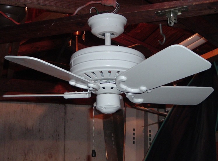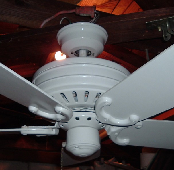 Fasco Vanity Fair 30 Inch 5 blade ceiling fan from the 1980s, Has a three speed pull chain and a forward/reverse switch on the motor housing. This ceiling fan uses the ball and socket mounting system. Very neat and rare ceiling fan. |
