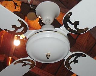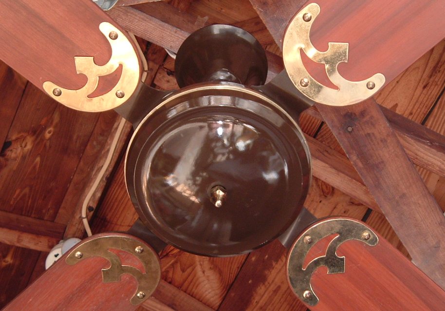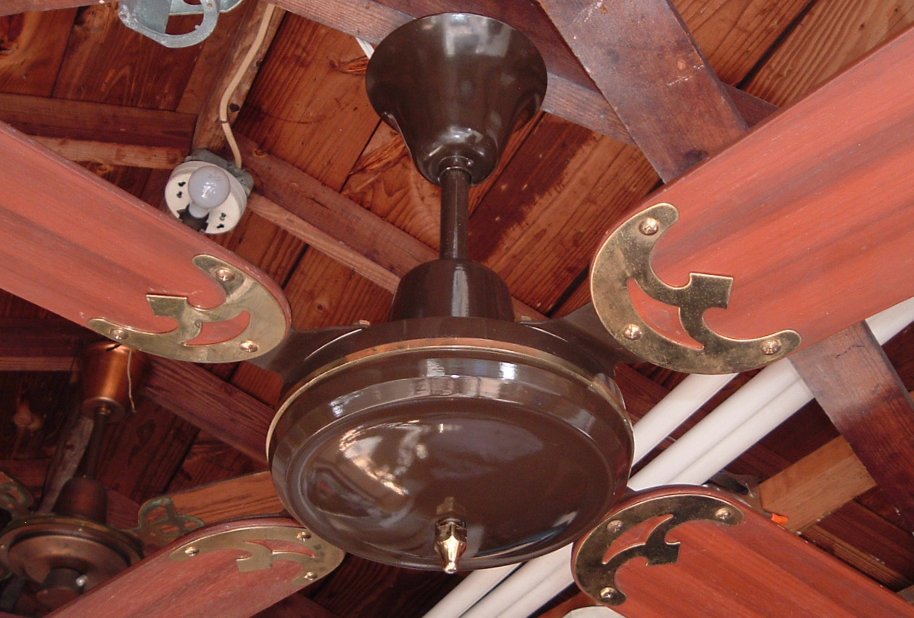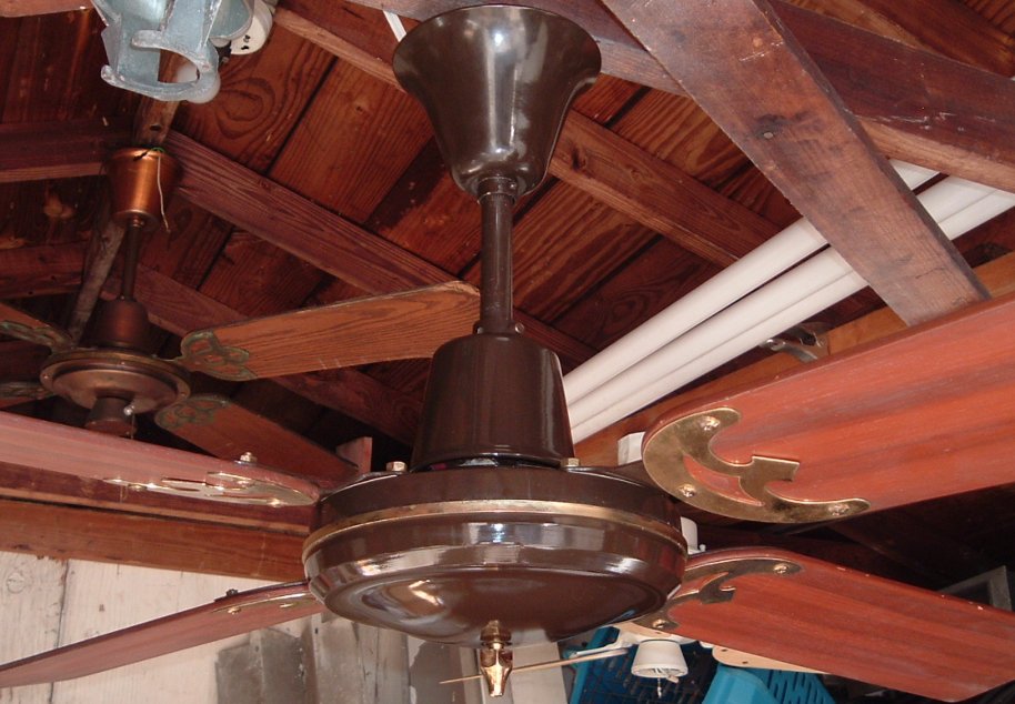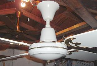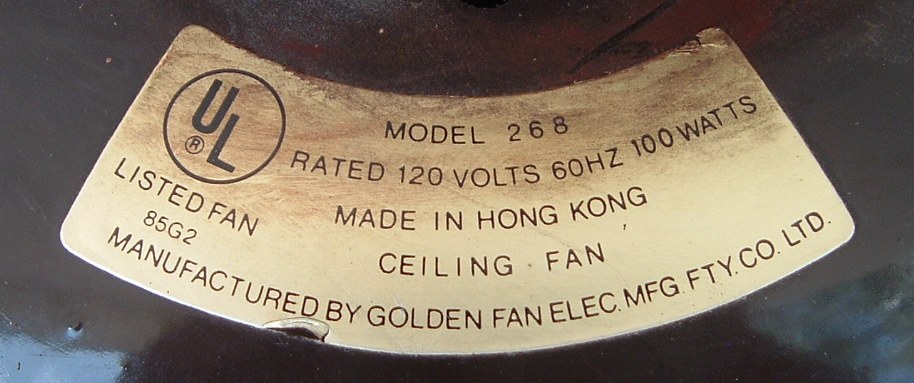 Golden Fan Electric MFG. FTY. CO. LTD. 52 Inch ceiling fans model 268 from the late 1970s to early 1980s. Made in Hong Kong. Heavy duty ceiling fans weights alot. Was sold with a five speed wall control. Uses a J-Hook to mount. This fan is light kit adaptable. These are quite popular ceiling fans, but are now becoming extinct. Great ceiling fan for it's day, and is built to last. |