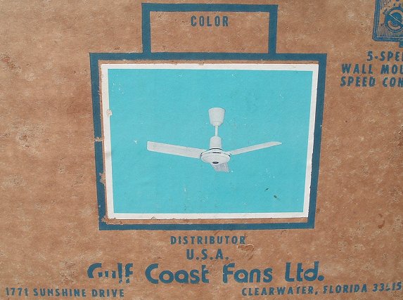 Gulf Coast Fans metal blade ceiling fan from the late 1970's. This ceiling fan was manufactured in Hong Kong by Din Wai Electrical MFG. CO. LTD (D.E.M.C), sold and distributed by Gulf Coast Fans of Florida. Motor is dated 8-3-78. Uses a five speed wall control. The box also contains three different down rods for the length of your choice. The Series was called The Sea Breeze. Gulf Coast Fans offered these in 36, 48, and 56 inches, and baked-on white, and dark brown colors. Neat Fan! |