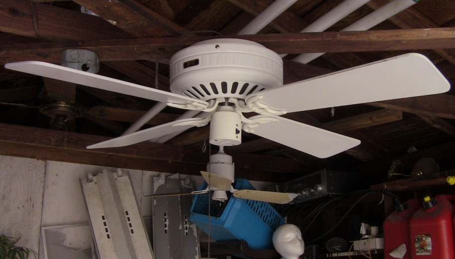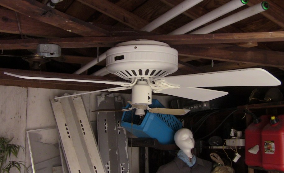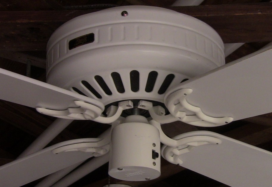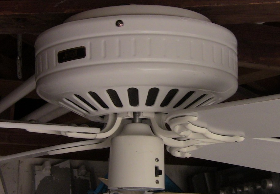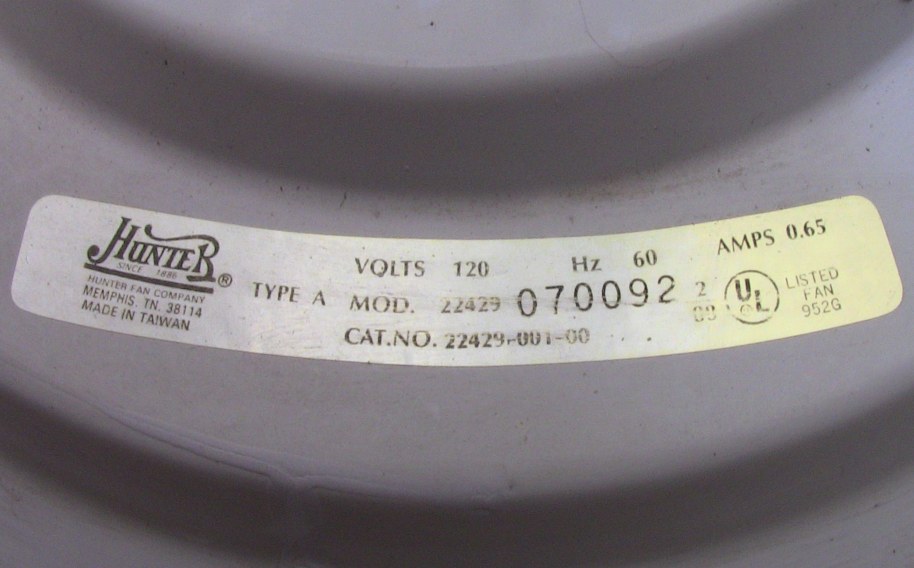 Hunter Low Profile ceiling fan Cat. No. 22429-001-00. The model number is 22427. This ceiling fan was from the second quarter of the year 1988. April - June of that year. Hunter started this version of the Low Profile in late 1985, early 1986. There's an earlier version that's very rare, and also a Low Profile version of the Hunter Original. These are the versions that took off, and are a bit more common than the earlier versions. Offered in antique brass, brass, and white, and 42" and 52" sizes. Made in Taiwan for the Hunter Fan Company. Has a three speed pull switch, and a forward/reverse switch. A hugger bracket mounted ceiling fan. Neat Fan!! |