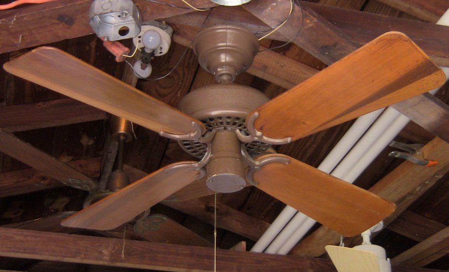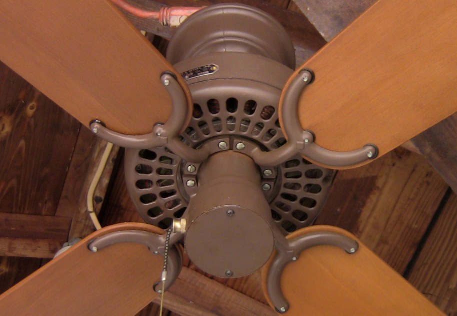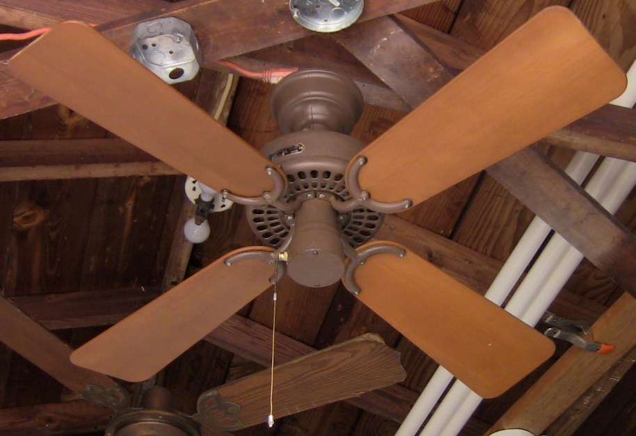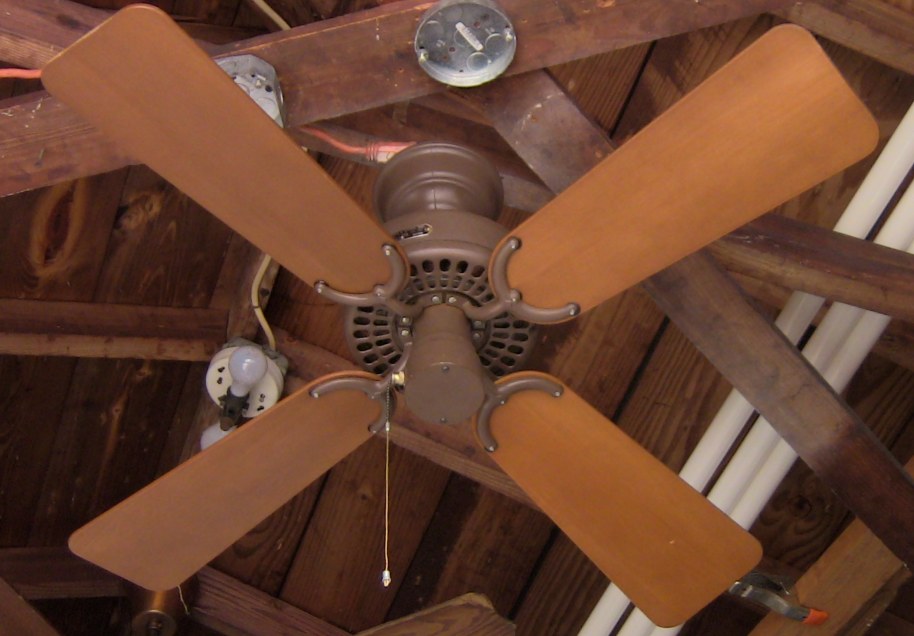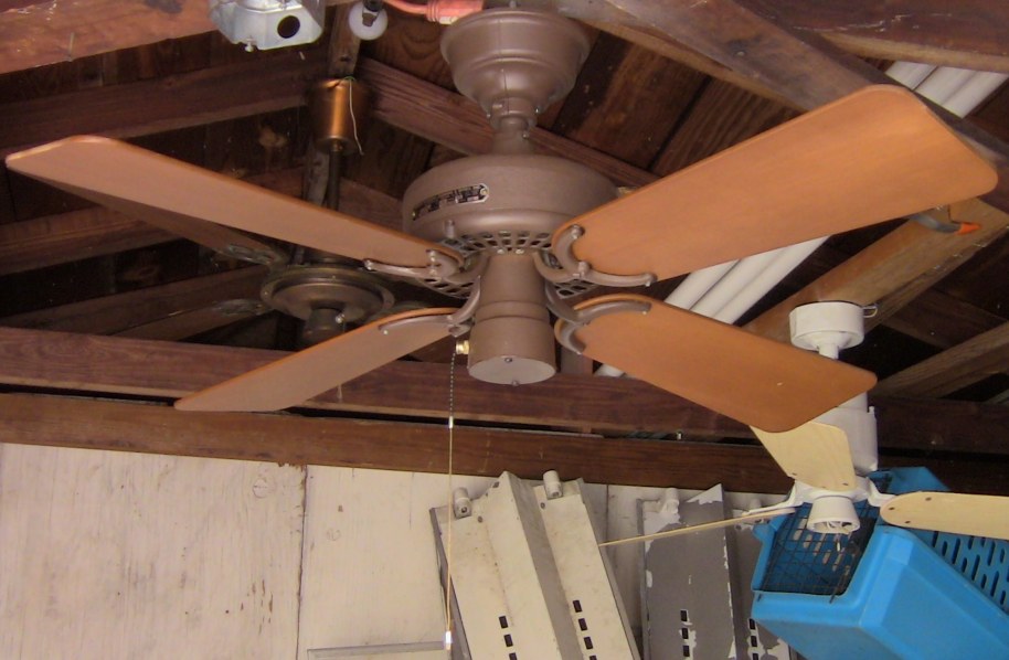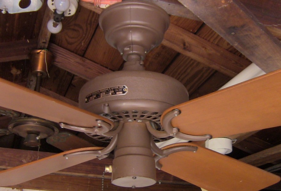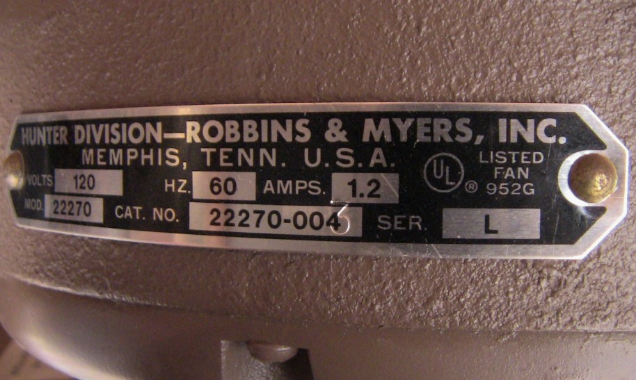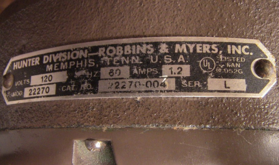 Hunter Original (Robins and Myers) 36 inch ceiling fan Cat. No. 22270-004 from the year 1980. A chestnut brown model. The model number is listed as 22270. Has a two speed pull chain. Made in the USA. Hunter Original ceiling fans have been in production for over 100 years, of course in different forms. Everybody knows about the Hunter Originals. They are seen everywhere, especially in places like bars and restaurants, running at a very slow speed. This is a classic. |