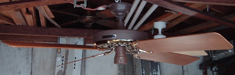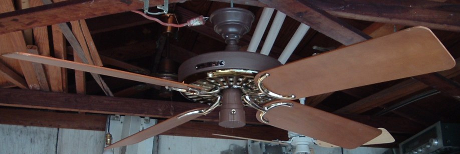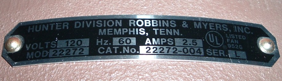 Hunter, Division of Robbins & Myers, Inc. "The Original" ceiling fan CAT. No. 22272-004 from the year 1980, also listed as model number 22272. The finish is chestnut brown and brass. This ceiling fan has a two speed pull switch. This model has half moon shaped blade irons which was discontinued in 1984. Hunter Original ceiling fans have been in production for over 100 years, of course in different forms. Everybody knows about the Hunter Originals. They are seen everywhere, especially in places like bars and restaurants, running at a very slow speed. Neat Fan!!