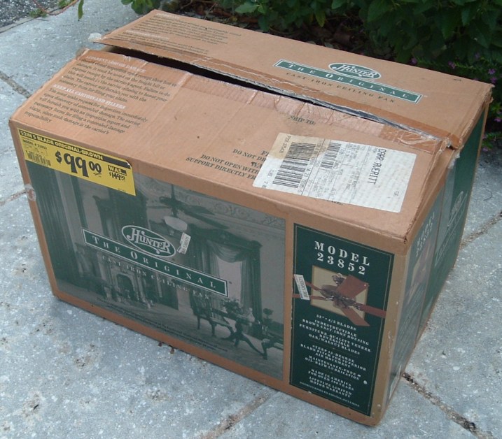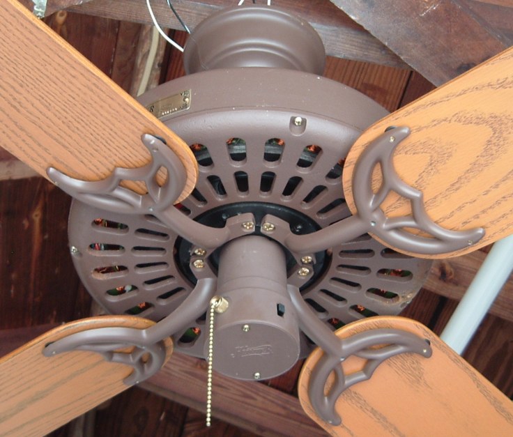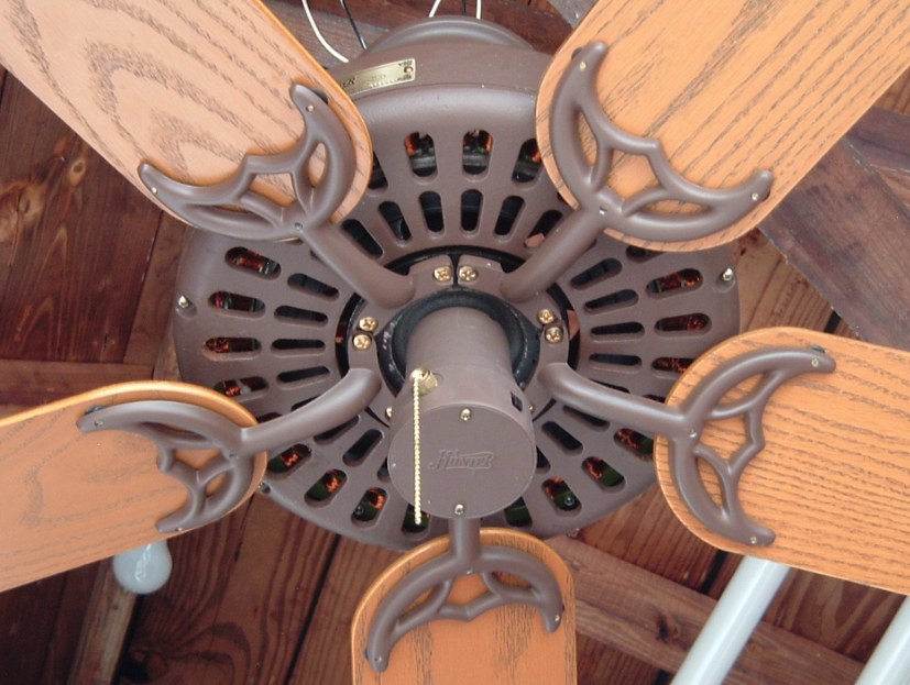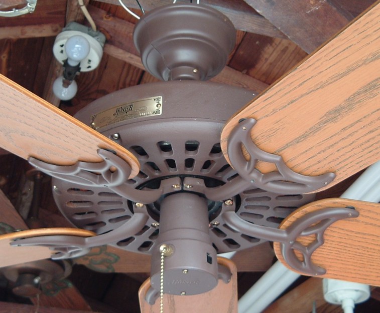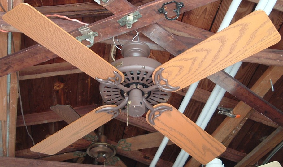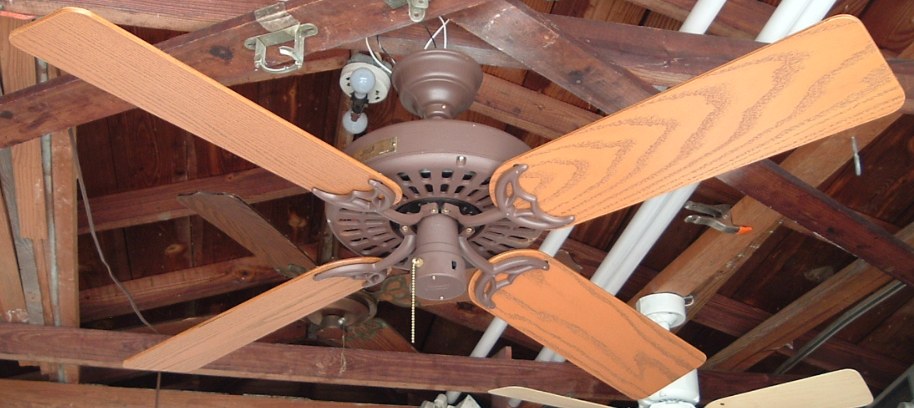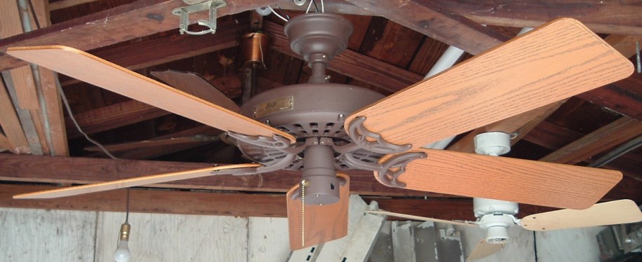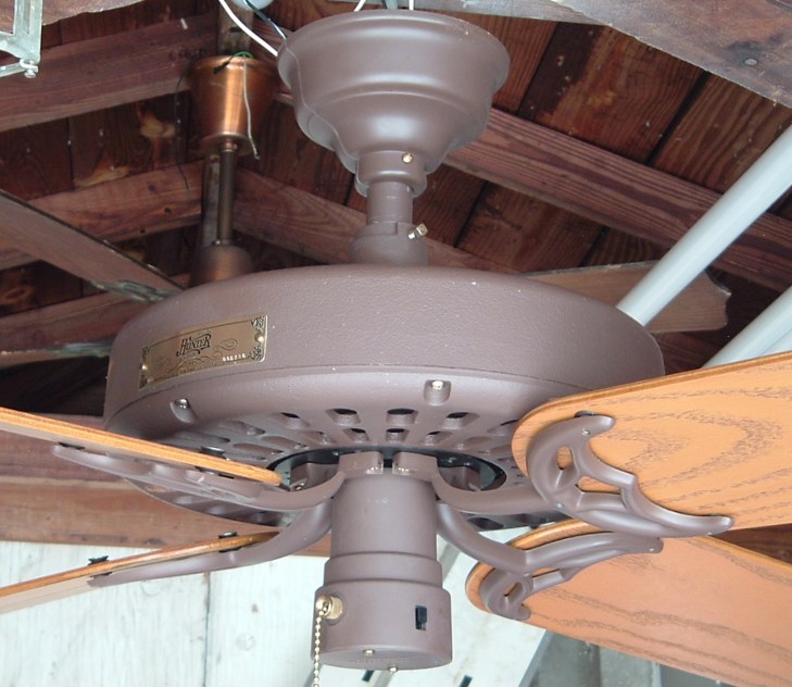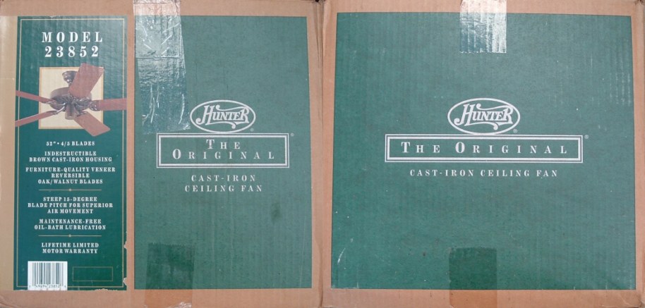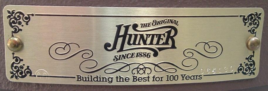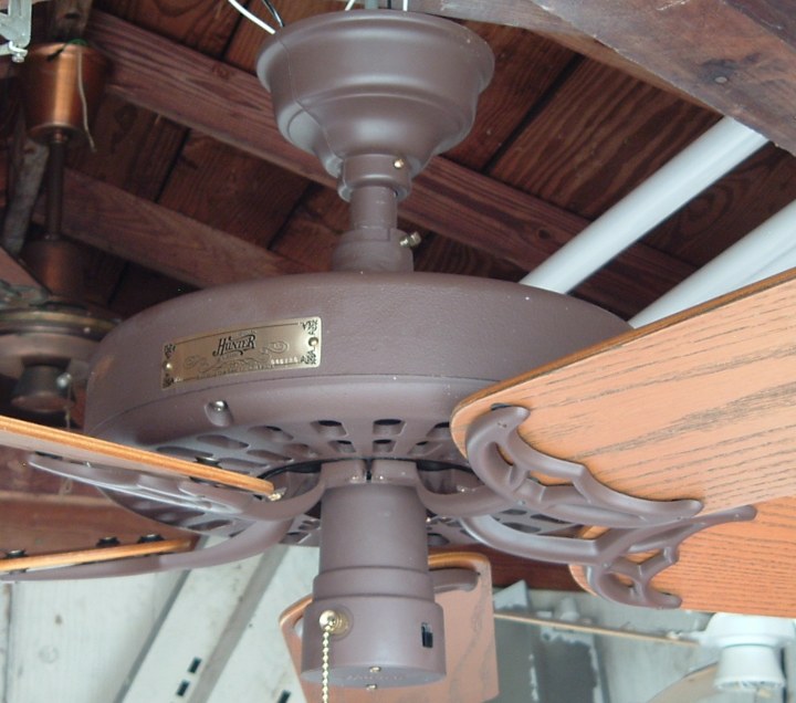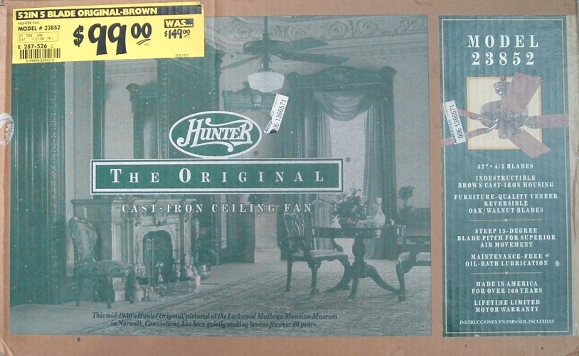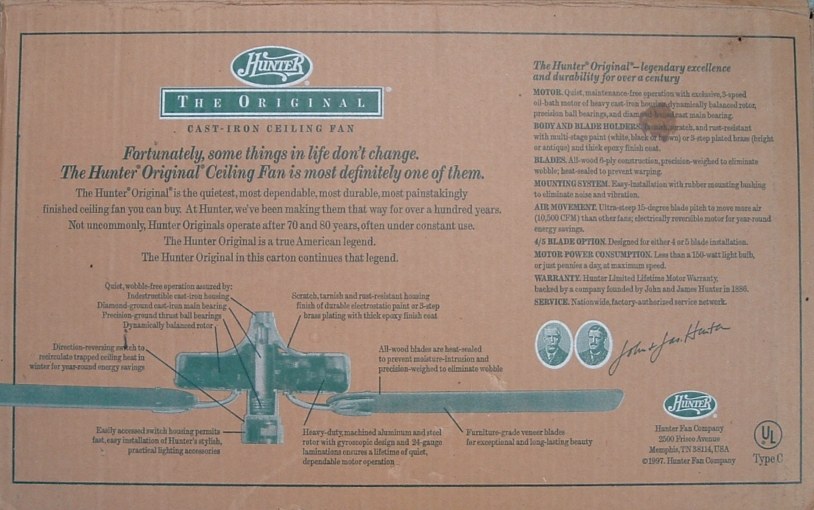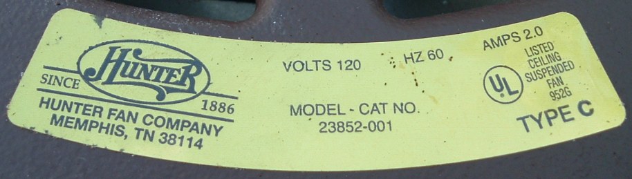 Hunter "The Original" ceiling fan model - CAT. No. 23852-001 from the year 2000. Also listed as model number 23852. This ceiling fan has a three speed pull switch and a forward/reverse switch. The finish is chestnut brown. This ceiling fan is also set up for both four and five blade configuration. Uses a U-Hook to mount. Hunter Original ceiling fans have been in production for over 100 years, of course in different forms. Everybody knows about the Hunter Originals. They are seen everywhere, especially in places like bars and restaurants, running at a very slow speed. Neat Fan!!