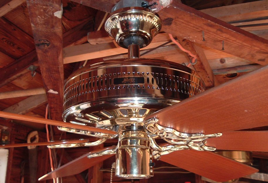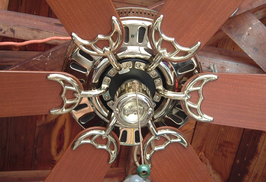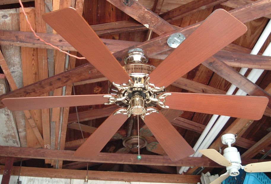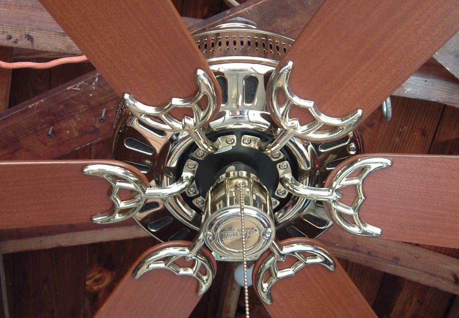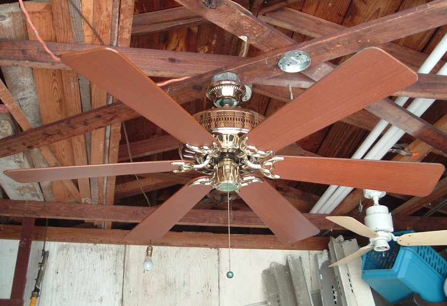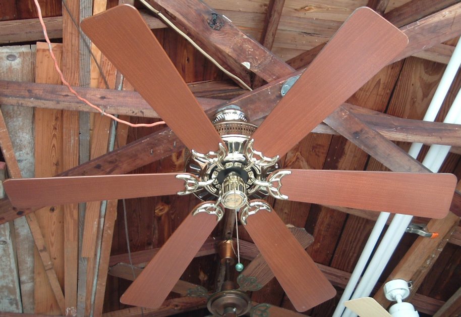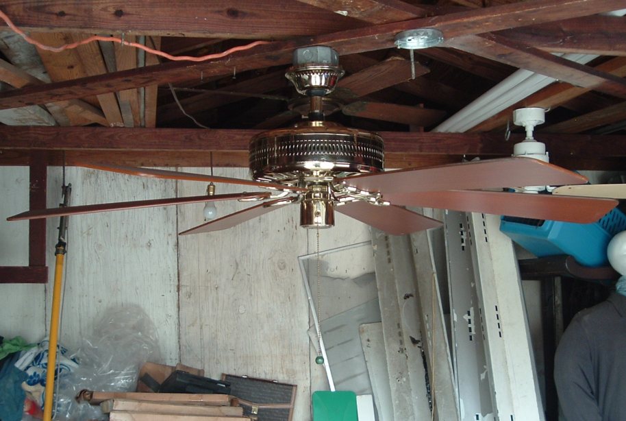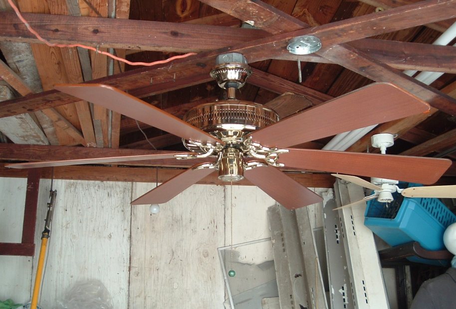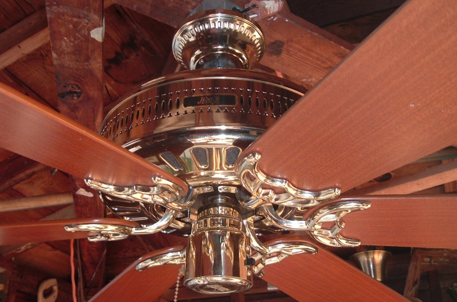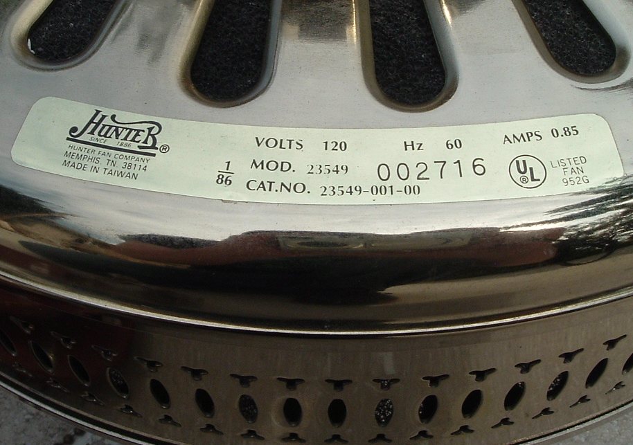 Hunter Studio Series ceiling fan model 23549 from the mid 1980s. Cat. No. is 23549-001-00. Dated the first quarter of 1986. January - March of that year. Sold exclusively for Home Depot, meaning this version was only sold at Home Depot stores. These six blade versions were offered in brass and antique brass finishes. Came out at the same time or shortly after Hunter started the Studio Series models. 52 inches. Has a three speed pull switch, and a forward/reverse switch. Ball and Socket bracket mounting is used to mount this ceiling fan. Made in Taiwan for the Hunter Fan Company. The Studio Series still continues today, albeit in a different form. This is the original design of the Studio Series, and is very rare. Neat Fan!! |