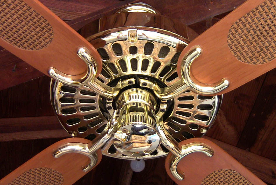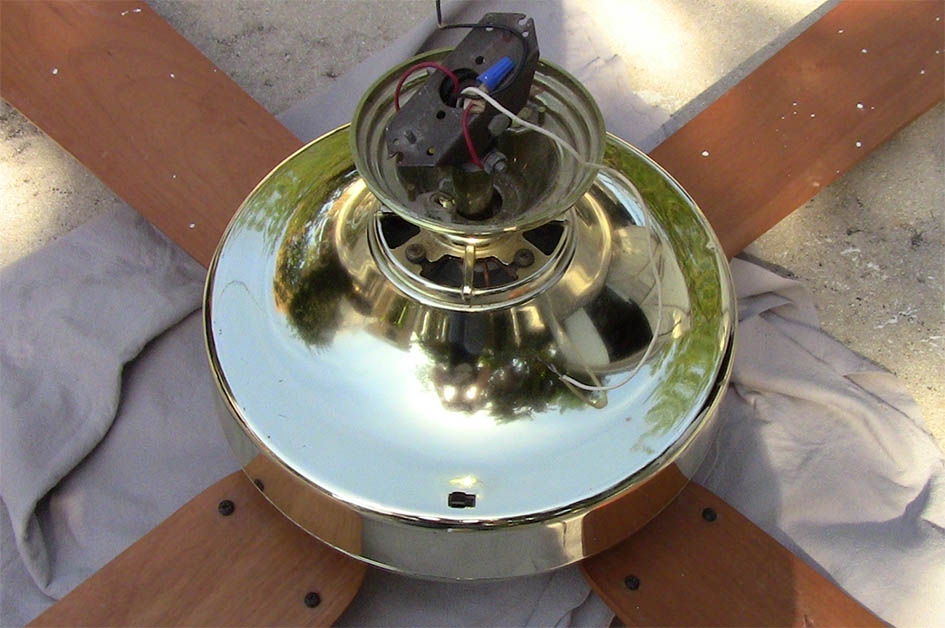 Hunter Original. Very cheap ceiling fan made of all plastic with a small stack motor with plastic flywheel and blade brackets. The flywheel has a dip to give each blade a pitch. Plastic canopy is the same design seen on