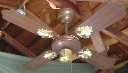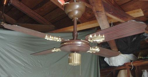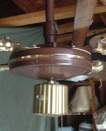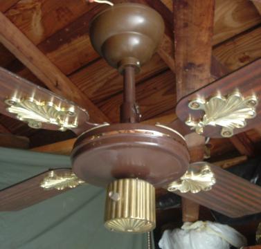 S.M.C. Laguna ceiling fan model KB 36 from the early to mid 1980s. This ceiling fan uses the J-Hook mounting system. Has a two speed, forward/reverse pull chain and a variable speed control that works with both speeds. There are many S.M.C. spinner ceiling fans that look like this one. |