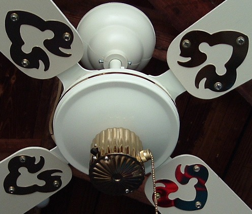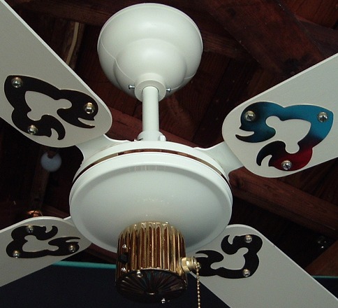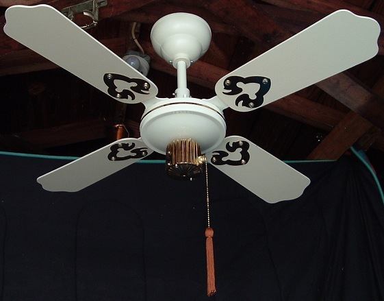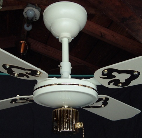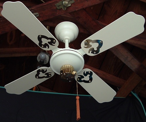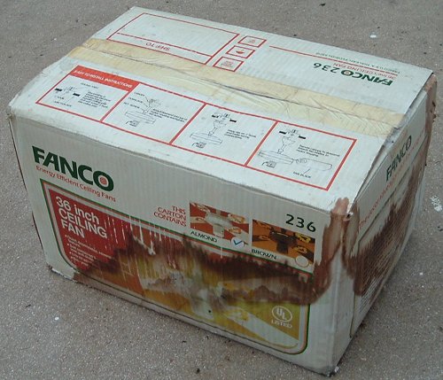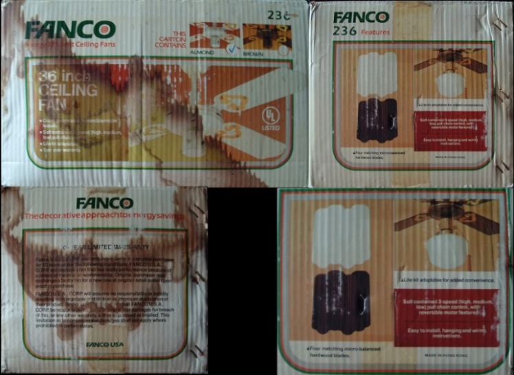 Fanco (S.M.C. Laguna) ceiling fan model KB 36 from the early to mid 1980s. Box is labeled Fanco and the motor has the same label as all Lagunas do. Has a three speed pull chain and a forward/reverse switch. This ceiling fan uses the J Hook mounting system. On this model They they did away with the variable speed control. There are many S.M.C. spinner ceiling fans that look like this one. |