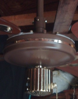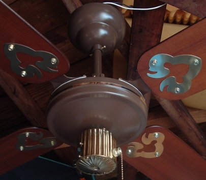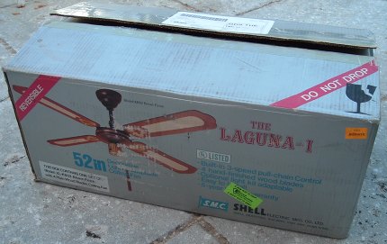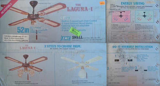 S.M.C. Laguna ceiling fan model KB52/48/42. This ceiling fan is from the mid 1980s, 1984 - 86 era. Unlike most S.M.C. Laguna ceiling fans, this one does not have a two piece plastic canopy, it has a whole metal canopy. This ceiling fan has a three speed pull chain and a forward/reverse switch. The switch housing is metal. S.M.C. did some minor changes to the 52 inch Laguna ceiling fans, without giving them a different model number. |