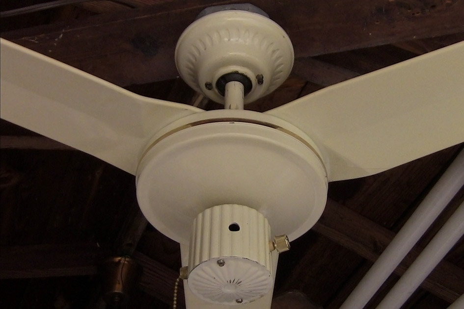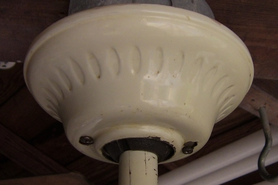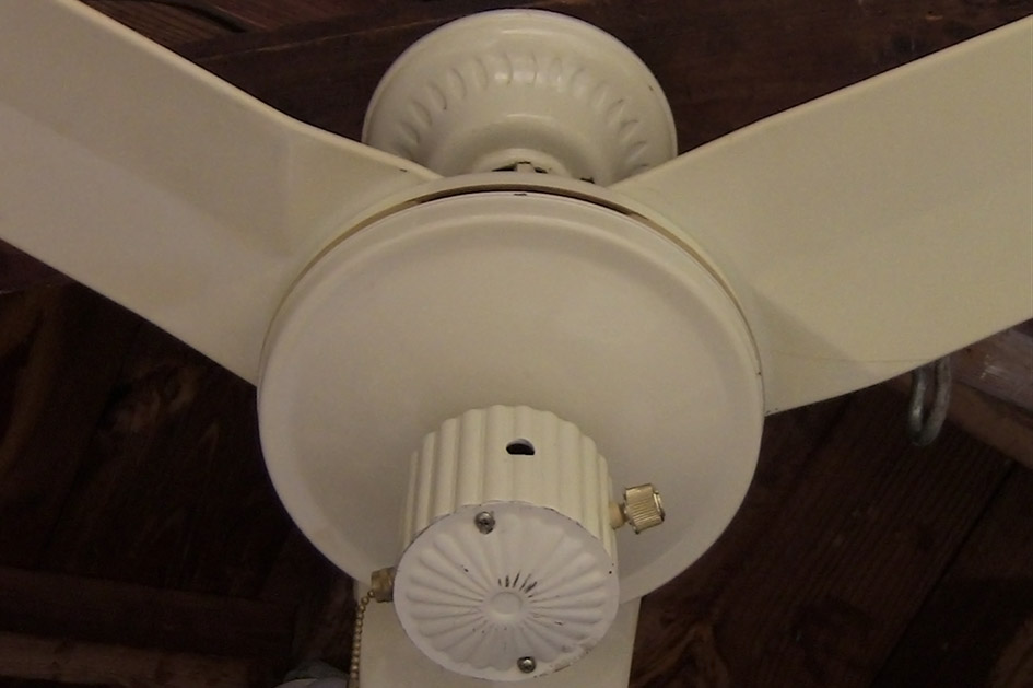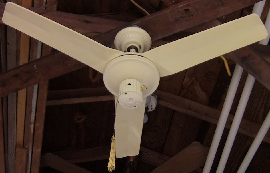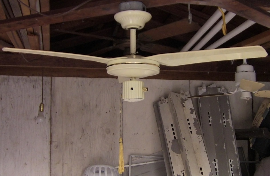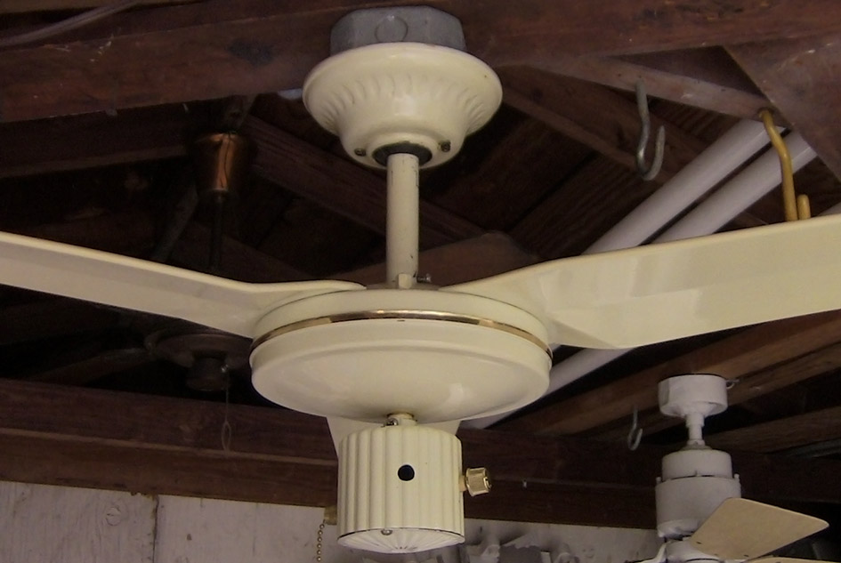 S.M.C. Laguna metal blade ceiling fan model D36 from the early-mid 1980s. Made in Hong Kong. This ceiling fan has a on/off pull switch, and a variable speed control, and is light kit adaptable. This fan uses ball and socket bracket mounting. Odd rare version of the Laguna series ceiling fans. Neat fan! |