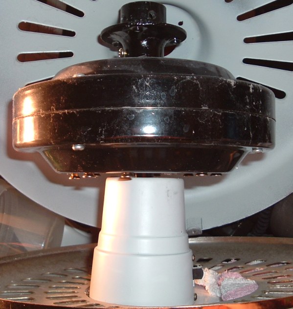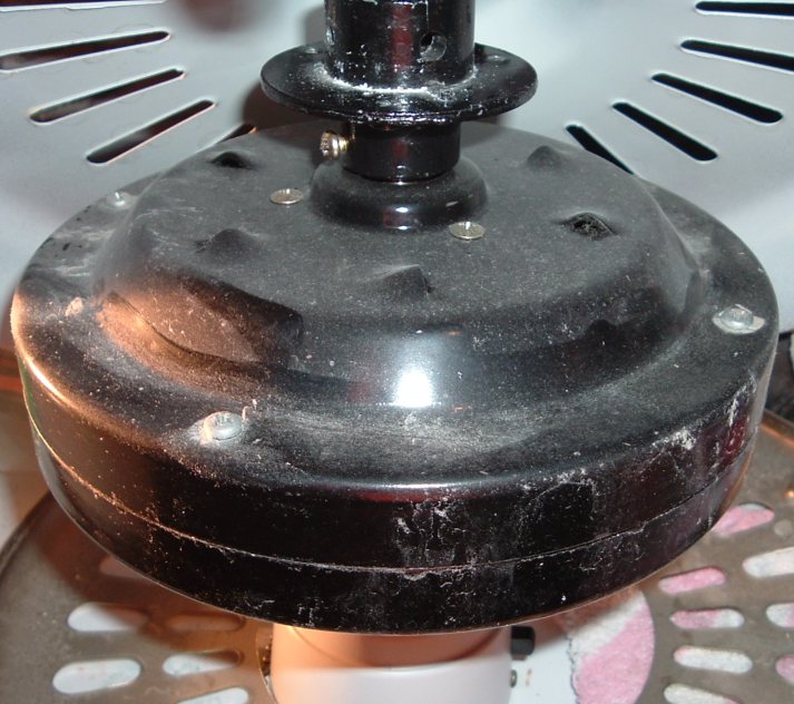Hunter Original. This model has a spinner motor. Has a three speed pull switch, and a forward/reverse switch. Ball and socket bracket system is used to mount this ceiling fan. Neat fan!! |