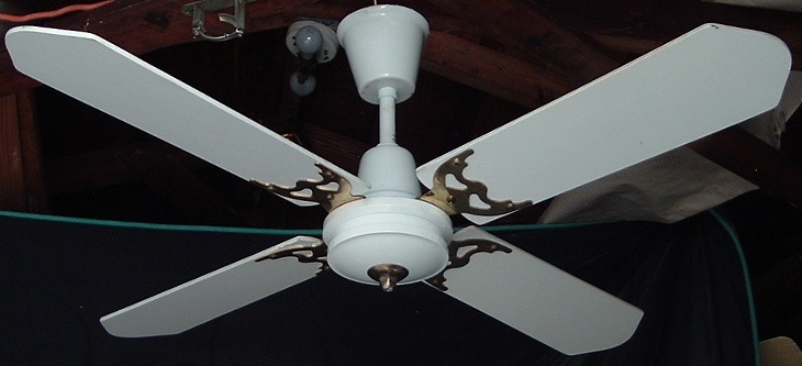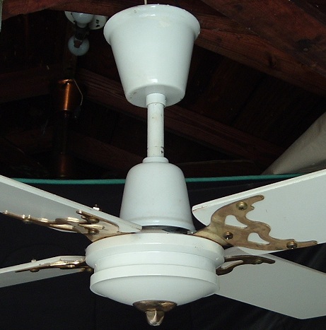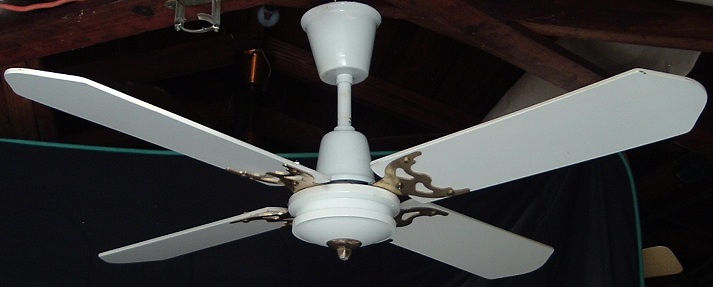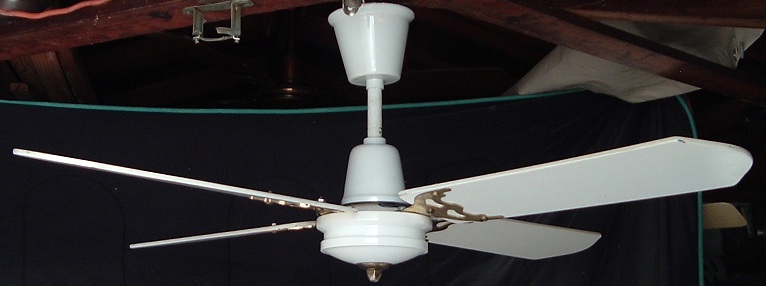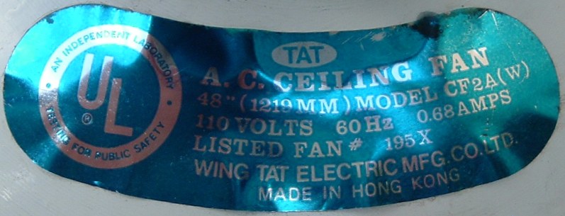 TAT ceiling fan model CF2A(W) from the late 1970s, early 1980s. Made in Hong Kong by Wing Tat Electric Mfg. Co. Ltd. This ceiling fan was sold with a five speed wall control and uses a J-Hook to mount. Neat fan! |